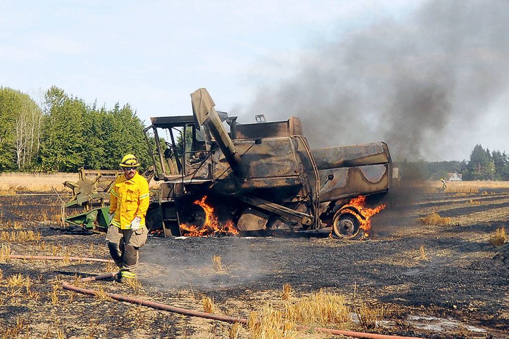 Flames engulf the tires of a combine that caught fire and spread into surrounding vegetation Friday afternoon. Smoke and flames fanned across a farm field west of Carlsborg Road near Sequim Valley Airport.