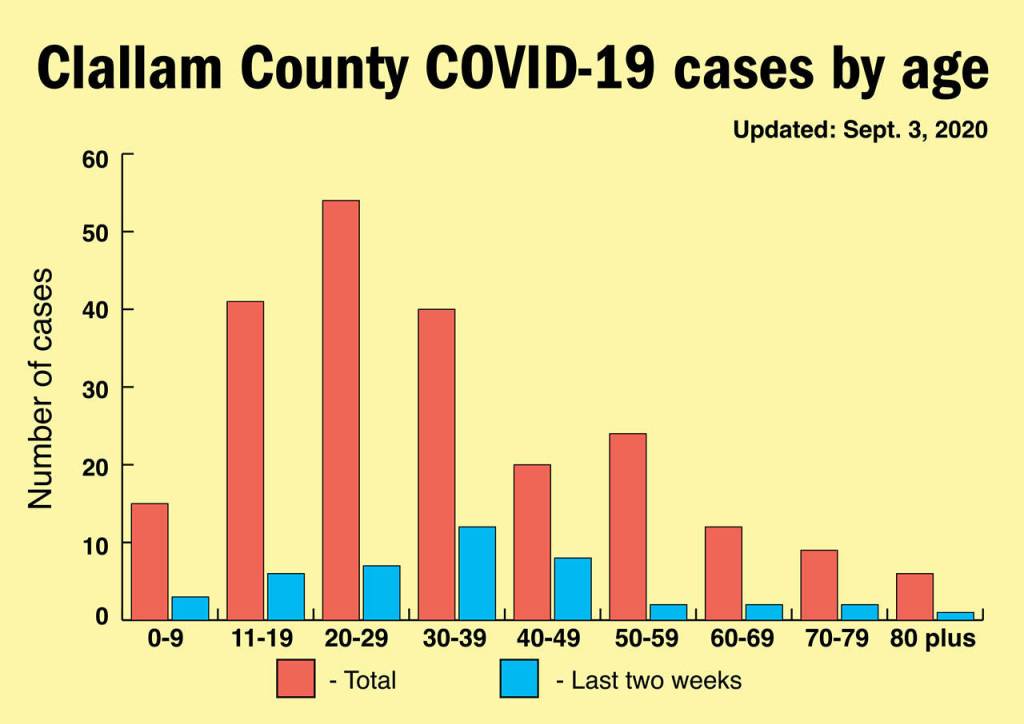 Updated numbers released Thursday show that young people continue to drive new cases in Clallam County. About 55 cases are in the 20-29 age range, and 41 cases in the 10-19 age range. Another 41 cases are in the 30-39 age range. The 30-39 age range has been the biggest source of new cases in the past two weeks.
