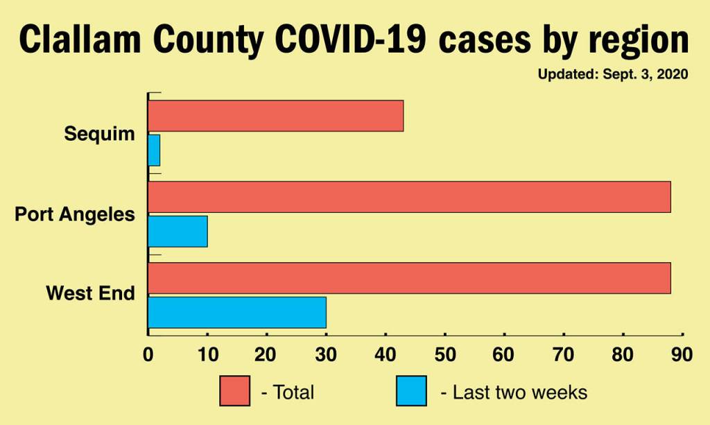 The West End is driving many of the recent cases. In the past two weeks, there have been 30 positives on the West End, 10 in Port Angeles and two in Sequim. Port Angeles and the West End each have had the same number of cases since March — 87 — while Sequim has had 43 total cases.