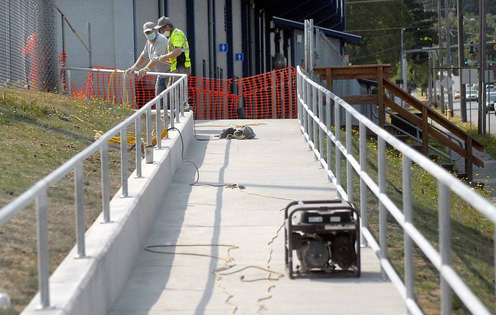 Rusty Spencer, left, and Tom Brogan of Montesano-based Simmons & Sons Contracting work to install handrails on a newly constructed wheelchair ramp that leads from the parking lot to the field level of Civic Field in Port Angeles.