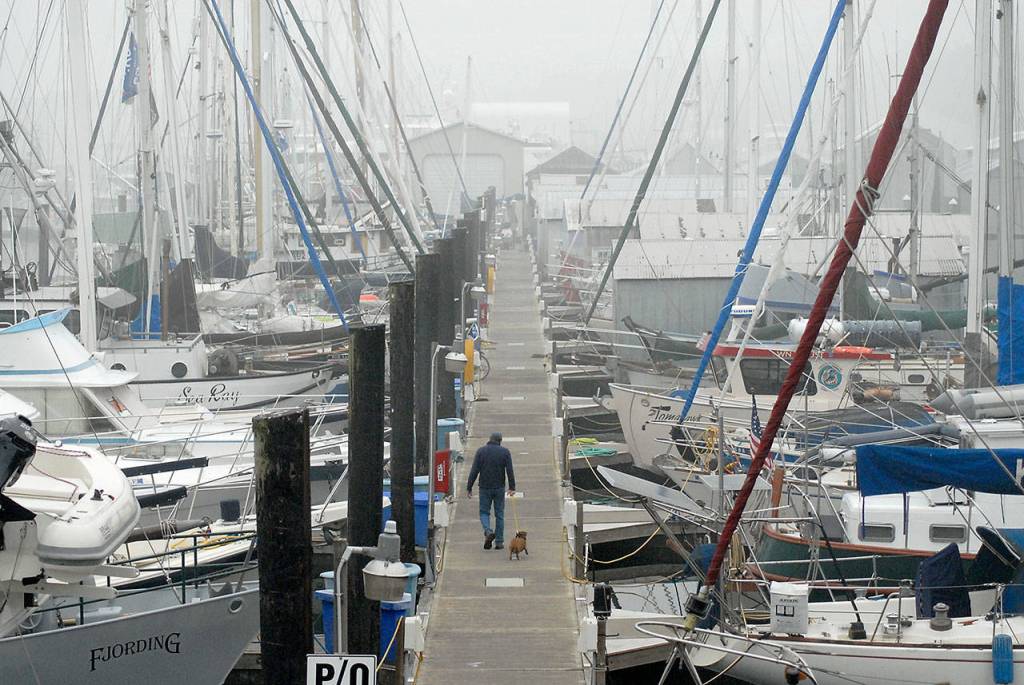 A man walks his dog along a smoke- and haze-shrouded dock at Port Angeles Boat Haven on Tuesday, Sept. 15, 2020.