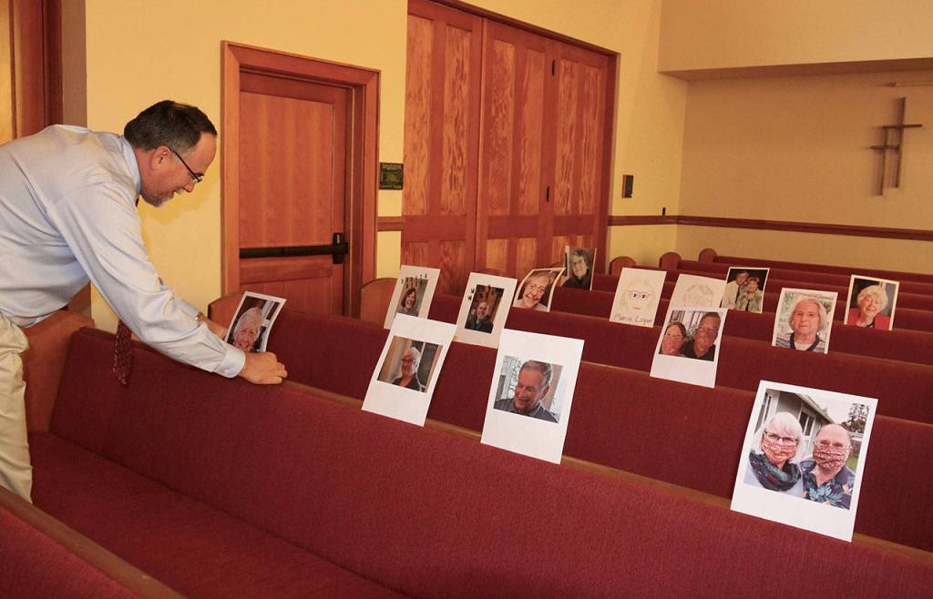 Pastor Matt Paul adds photos to the pews in the sanctuary of the First Presbyterian Church, 139 W. 8th St., in Port Angeles.