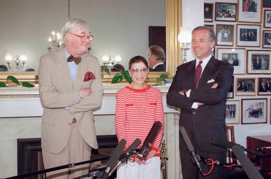 In this June 15, 1993, file photo, Judge Ruth Bader Ginsburg poses with Sen. Daniel Patrick Moynihan, D-N.Y., left, and Sen. Joseph Biden, D-Del., chairman of the Senate Judiciary Committee on Capitol Hill in Washington. The Supreme Court says Ginsburg has died of metastatic pancreatic cancer at age 87. (Marcy Nighswander/Associated Press file)