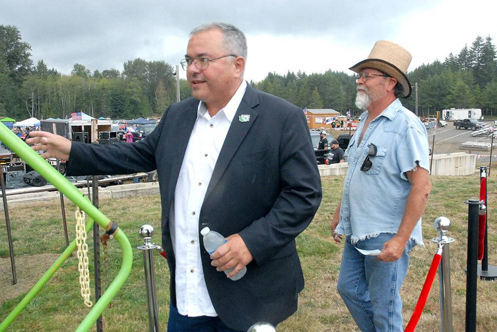 PORT ANGELES — Washington gubernatorial candidate Loren Culp, Republican now living in Republic, left, approaches the stairs to the announcers tower at Extreme Sports Park west of Port Angeles followed by event organizer Lyle Hagen during a speaking event Saturday. An estimated crowd of over 1,000 people attended the gathering protesting Gov. Jay Inslee’s policies concerning wildfires, COVID-19 and other issues. Look for a story in Monday’s Peninsula Daily News.