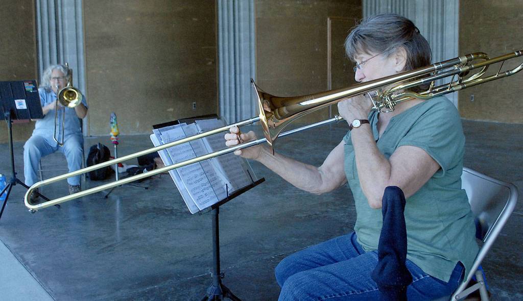 Cindy Mackay, front, a member of the Sequim City Band, and Bonnie Booth, who plays with numerous local ensembles, practice on their trombones at the James Center for the Performing Arts at Carrie Blake Park in Sequim on Monday, Sept. 26, 2020.