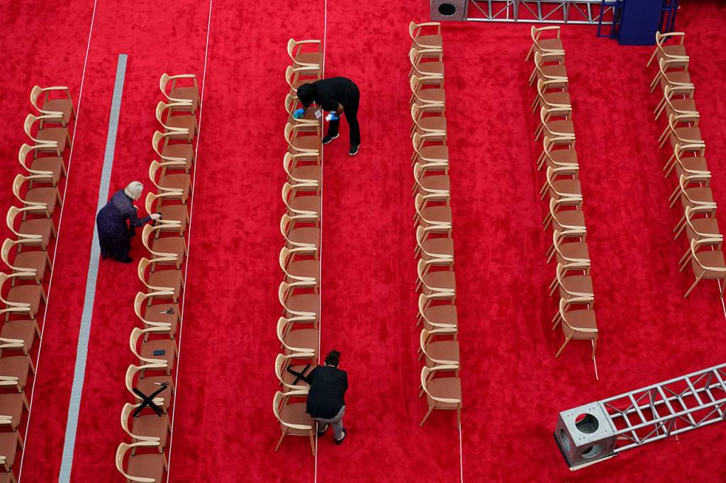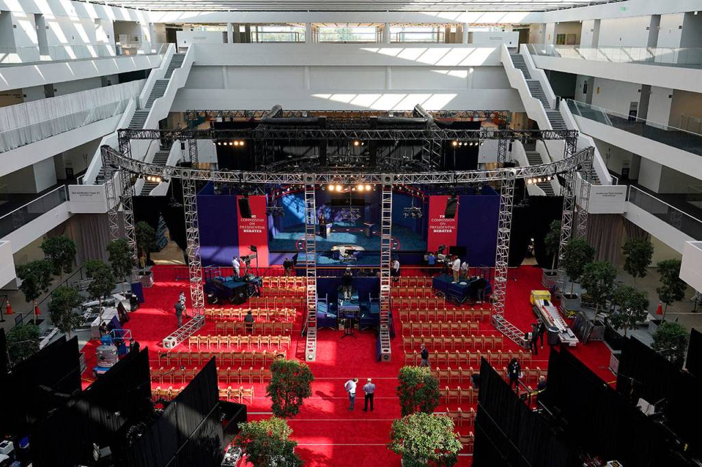 The scene in Cleveland was notably understated compared to typical election years, with none of the pomp and pageantry. Instead of the usual auditorium, the debate is being held in an atrium on Case Western University’s campus and signs were placed on two of every three three chairs reading, “Thank you for not sitting here in observance of social distancing.”
