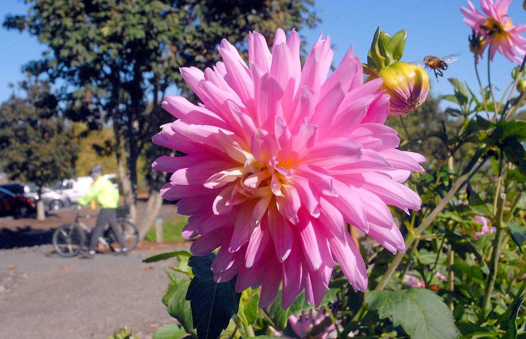 A bee buzzes around a Chilson’s pride dahlia in bloom at the Sequim Botanical Garden at the city’s water reclamation park.