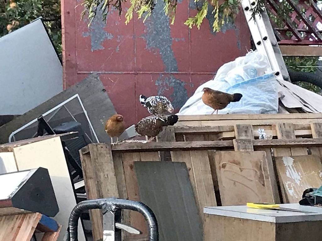Several chickens could be seen Friday morning wandering around in the debris. Noncommercial animal husbandry is not permitted and is one of the violations.
