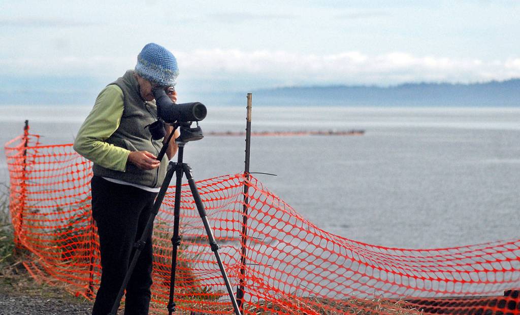 Maxine Reid of Marysville uses a spotting scope to look for birds on Port Angeles Harbor from Ediz Hook in Port Angeles on Wednesday, Nov, 4, 2020.