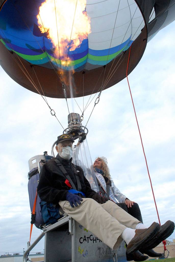 U.S. Navy veteran Lt. Cmdr Frank Hurlbut, 92, a resident of Sinclair Place assisted living community in Sequim, takes a teathered balloon ride with Capt. Crystal Stout of the Dream Catcher Balloon Program on Wednesday. Hurlbut, who as a Navy pilot during his time of service, was one a several Sinclair Place residents who were offered the opportunity to take short rides to enjoy the view.
