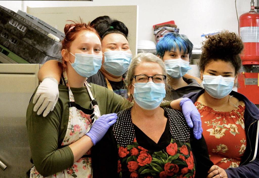 She and four of her foster daughters, wearing their masks, had grins clearly visible in their eyes as they ladled out mashed potatoes and gravy.