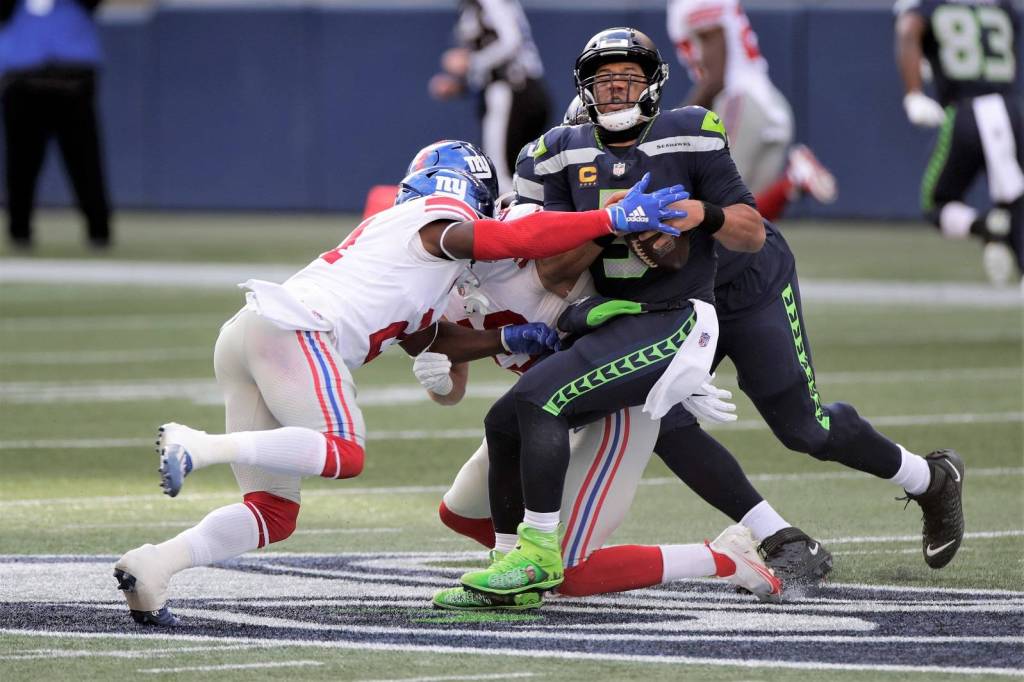 He was sacked five times, a number of those simply from holding the ball too long. The biggest sack came in the closing seconds when Leonard Williams threw Wilson for an 8-yard loss on third down. A fourth-and-18 desperation throw by Wilson was batted down, and the Giants were left to celebrate.
