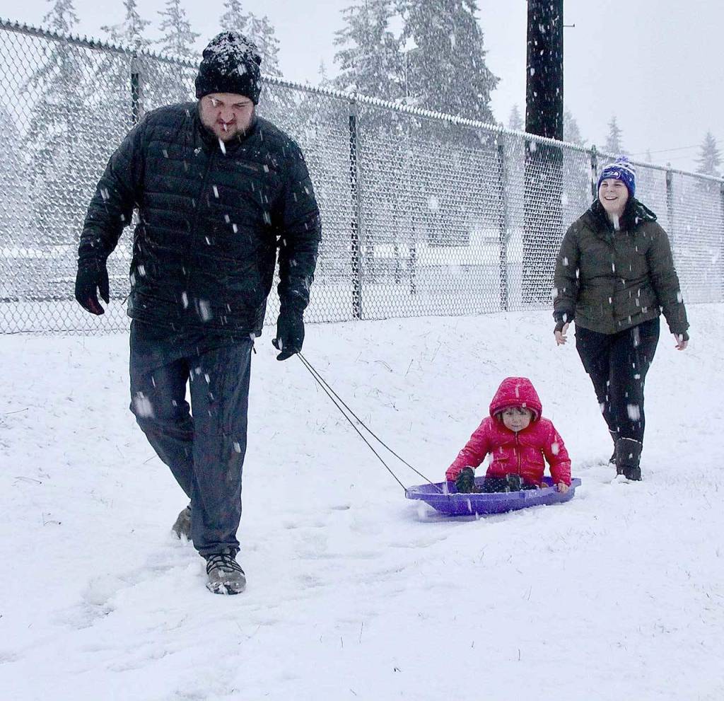 Jarrett and LeAnn Hansen took their daughter H.J., 2, out sliding just outside the fence of Elks Playfield on Pine Street on Monday during the first snow of the winter. (Dave Logan/for Peninsula Daily News)