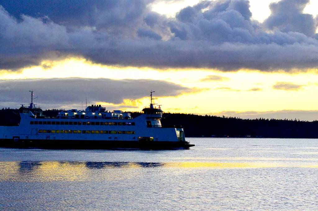 A hint of sunlight shines on a Washington State Ferry on Tuesday, Dec. 22, 2020, the day after the winter solstice, as it sails into Port Townsend.