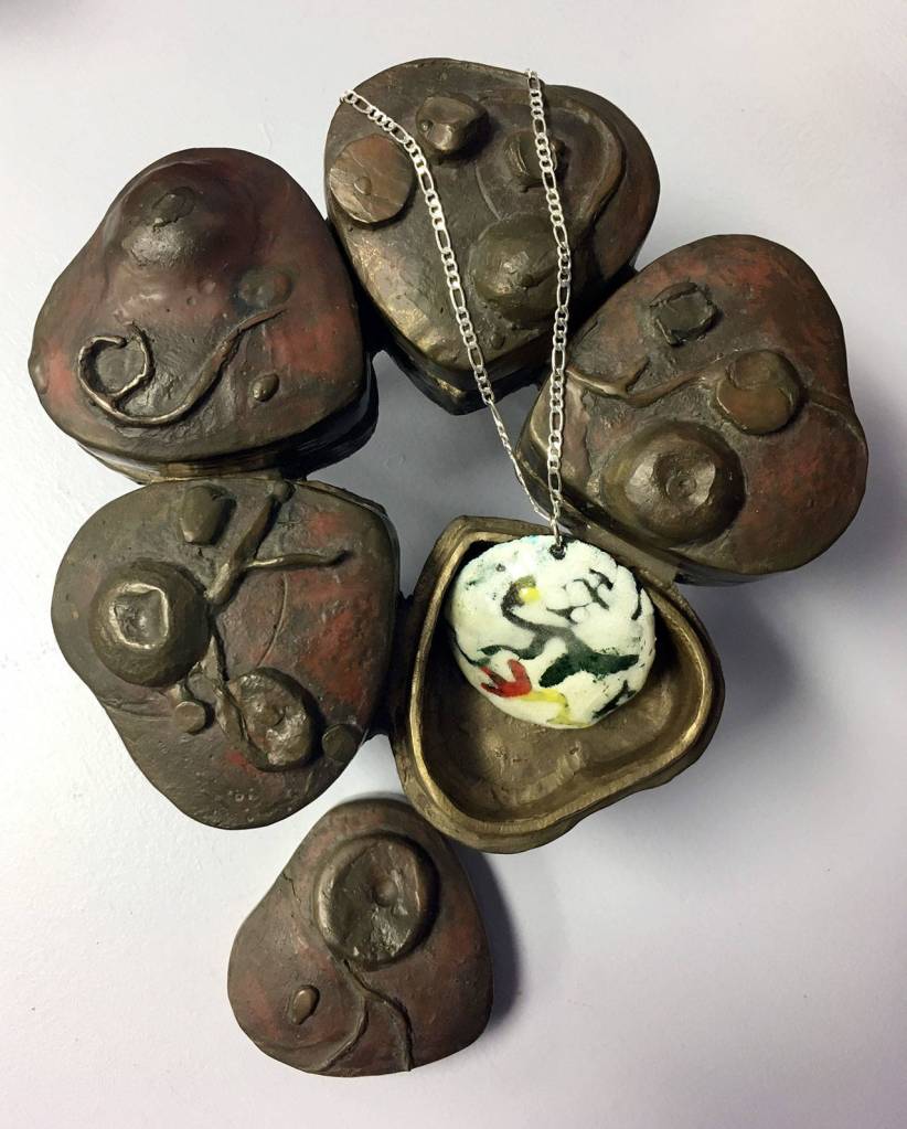 Silver, copper, and bronze is cast using the lost wax process in a kiln and sometimes included in her wire wrapping and beading. Enamels are layered to create earrings, pins, and other objects of art. Repousse is used to bring depth, textures, and details.