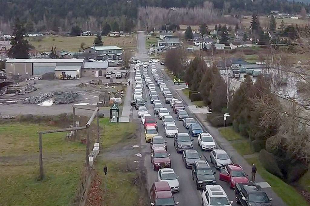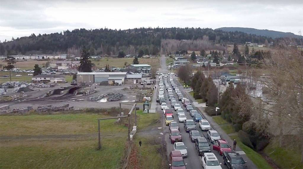 SEQUIM — The line of Sequim residents awaiting a COVID-19 vaccine during the town’s first clinic, a drive-through, extended back to the to the U.S. Highway 101/Simdars Road exit from the check-in site at 100 S. Blake Ave.