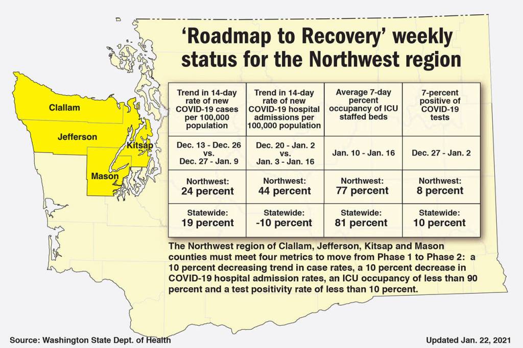 According to the state Health Washington Dashboard, the region as of Friday was meeting just two out of four criteria for moving to Phase 2 — an ICU occupancy under 90 percent (77 percent in the Northwest Region) and 10 percent or lower positivity rate on COVID-19 tests. The region is at 8 percent.