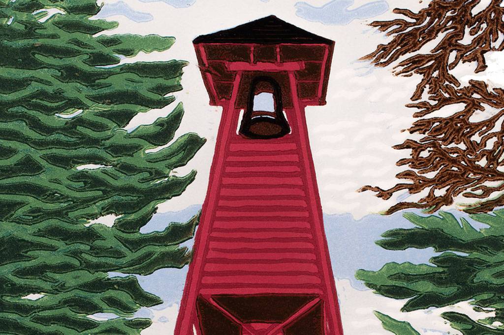 Carrico’s “Fire Bell Tower” is an original reduction linoleum print of an historical landmark in Port Townsend.