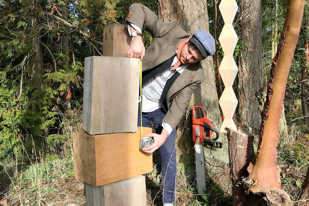 Jonah Trople of Port Townsend, working with wood outside his studio, has been chosen to create sculptural “art markers” for the city’s designated Creative District. (Port Townsend Main Street Program)