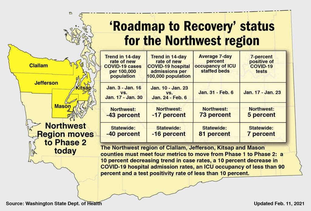 Berry said that the Northwest Region, which Clallam and Jefferson are a part of hit all four of the state’s COVID-19 “Roadmap to Recovery” metrics last week to allow moving to Phase 2.