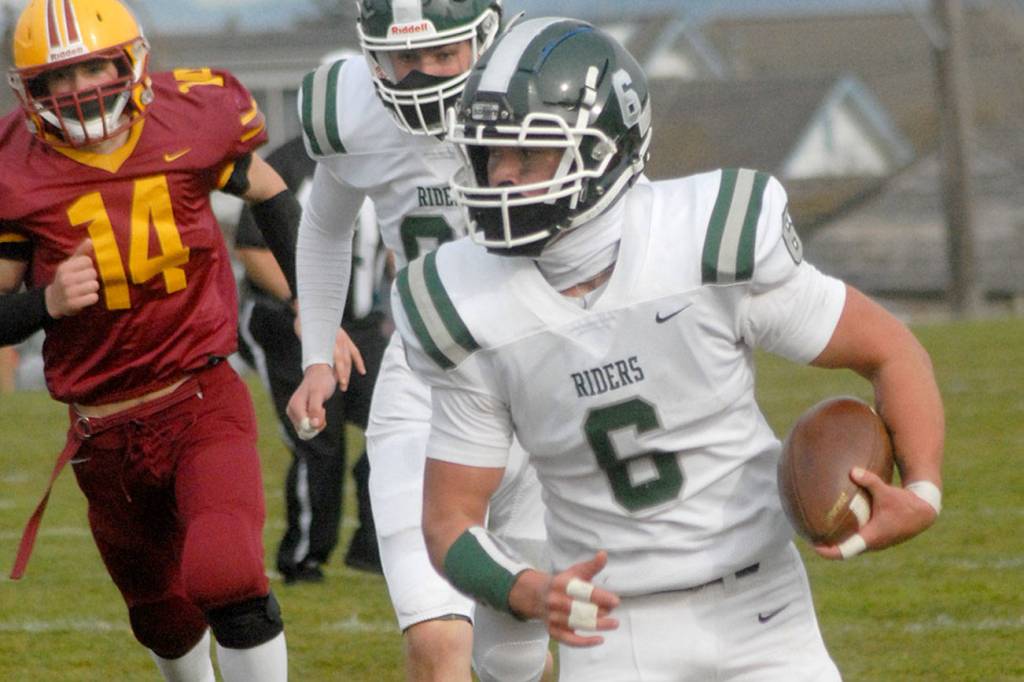Livingston got the ball rolling for Port Angeles, busting loose for a 55-yard touchdown run up the left sideline on the Riders’ first possession and setting up a 4-yard Daniel Cable touchdown run with a 27-yard rumble into the red zone. Livingston injured his left hamstring on the play, but still finished the game with a team-high 114 yards on eight carries.