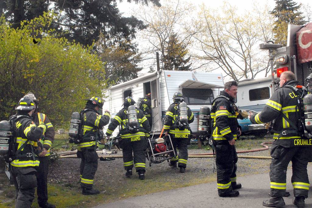 Clallam County District 2 firefighters work at the scene of a blaze that damaged a travel trailer at 2442 E. Highway 101, Space 25, of the Monroe Estates RV park in Port Angeles on Wednesday.