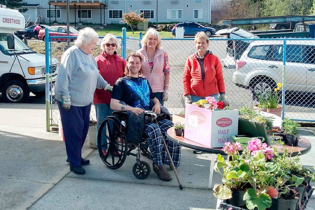 Members of the Port Angeles Garden Club recently gathered for a planting party at Crestwood Health and Rehabilitation. Club members added spring blooms to planters on the residents’ patio. Pictured standing, from left to right, are Bernice Cook, Kitty Gross, Shari Bley and Mary Kelsoe. Seated is Crestwood resident Troy Nicholaysen, who will will care for the plantings.