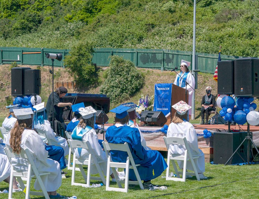 Chimacum class president, Morgan Liske, addresses her fellow graduates during a ceremony at Port Townsend’s Memorial Field on Saturday.