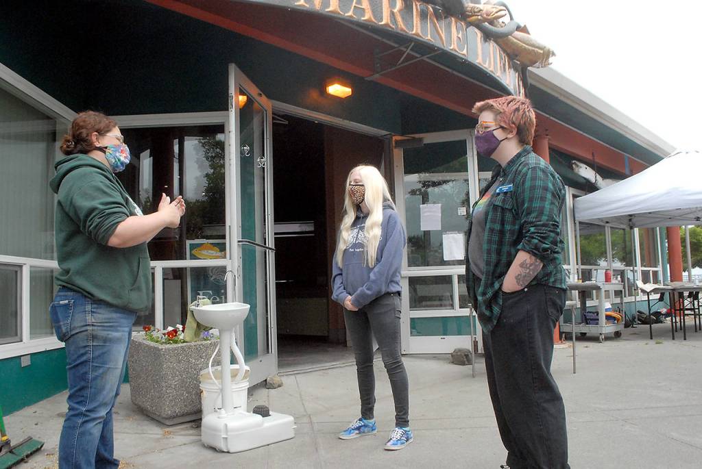 Feiro Marine Life Center Facilities Director Tamara Galvan, left, discusses admission procedures on Thursday with guest service specialists Disa Wilson, center, and Kennedy Cameron in preparation for today’s reopening for walk-up visitors at Port Angeles City Pier. (Keith Thorpe/Peninsula Daily News)