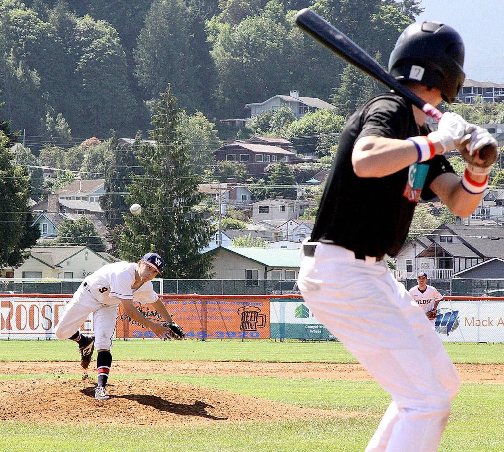 Logan Olson of Wilder Sr. fires a pitch to the plate against the WBS Colts Black team in Sunday’s semifinal. Wilder won 18-6 to move on to the championship game later that night, which Wilder also won 10-0 over the Riverdogs. (Dave Logan/for Peninsula Daily News)