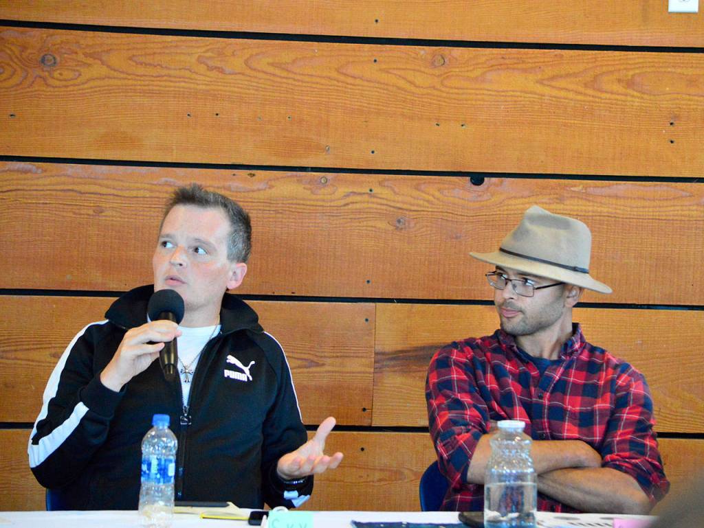 Among the six Port Townsend City Council candidates at Saturday’s housing forum were Sky Hardesty-Thompson, left, who’s running for Position 5, and Cameron Jones, who’s running for Position 1. (Diane Urbani de la Paz/Peninsula Daily News)