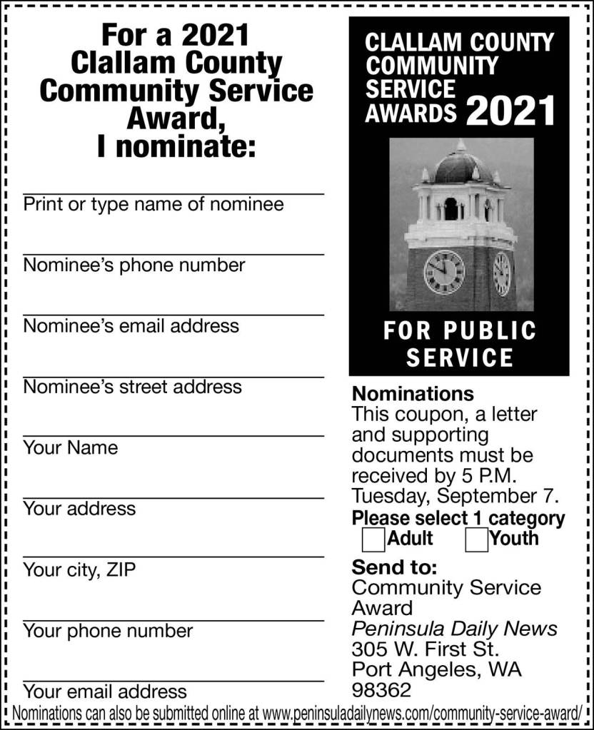 Anyone who lives in Clallam County can be nominated. Recipients of the Community Service Award in the past are not eligible for a 2021 award.