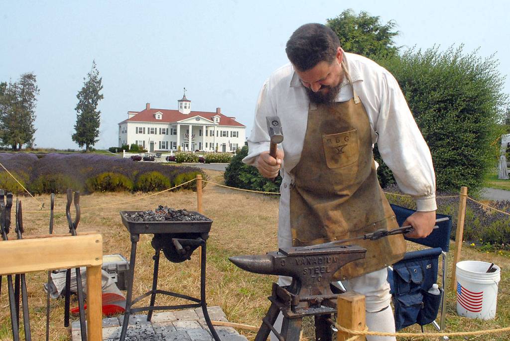 Blacksmith Keith Chester of Arlington pounds hot metal during a smithing demonstration on Saturday at Northwest Colonial Festival on the grounds of the George Washington Inn and Estate east of Port Angeles. The event featured displays, demonstrations and reenactments of life during the colonial era of the American Revolution.