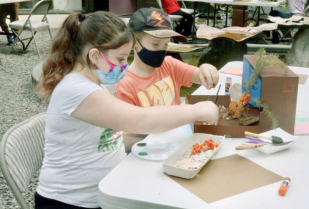Jasmine Paul, 9, left, and John Hall, 10, put together a habitat diorama in which animals might live in nature after gathering materials in Webster’s Woods at Port Angeles Fine Art Center.