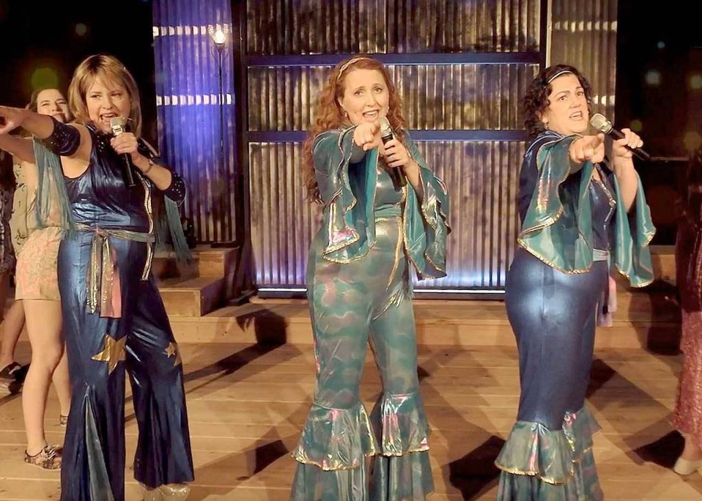 ”Broadway in Your PJs,” a Ghostlight Productions show available for streaming, features the “Dancing Queen” number from “Mamma Mia!” with, from left, Angela Poynter, Cecie McClelland and Jennifer Saul. (Photo courtesy of Ghostlight Productions)