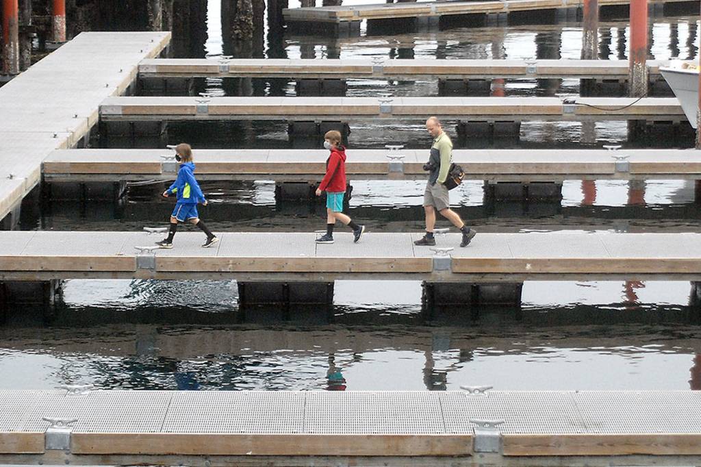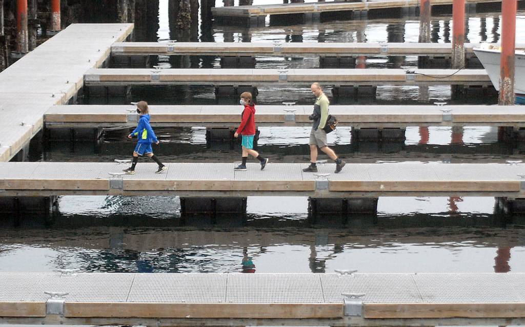 Kyle Dietrich, 9, left, Sam Dietrich, 9, and father Joe Dietrich, all of Toledo, Ore., walk along a floating dock used for transient moorage at Port Angeles City Pier on Thursday.