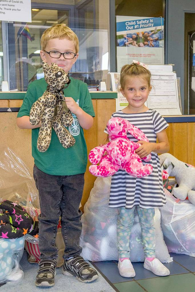 Nick, 5, and Josie, 4, of Great Futures Preschool, housed at the Sequim unit of the Boys & Girls Clubs of the Olympic Peninsula, hold stuffed animals sewn by members of the Sequim Fiber Arts Neighborhood Group of the American Sewing Guild for distribution at the club. (Emily Matthiessen/Olympic Peninsula News Group)