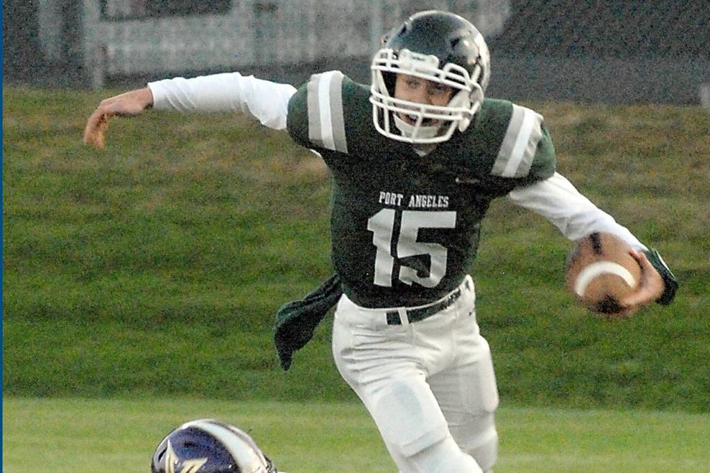 Port Angeles quarterback Parker Nickerson gets tripped up on a short run by North Kitsap's Benen Lawler on Friday night at Port Angeles Civic Field.