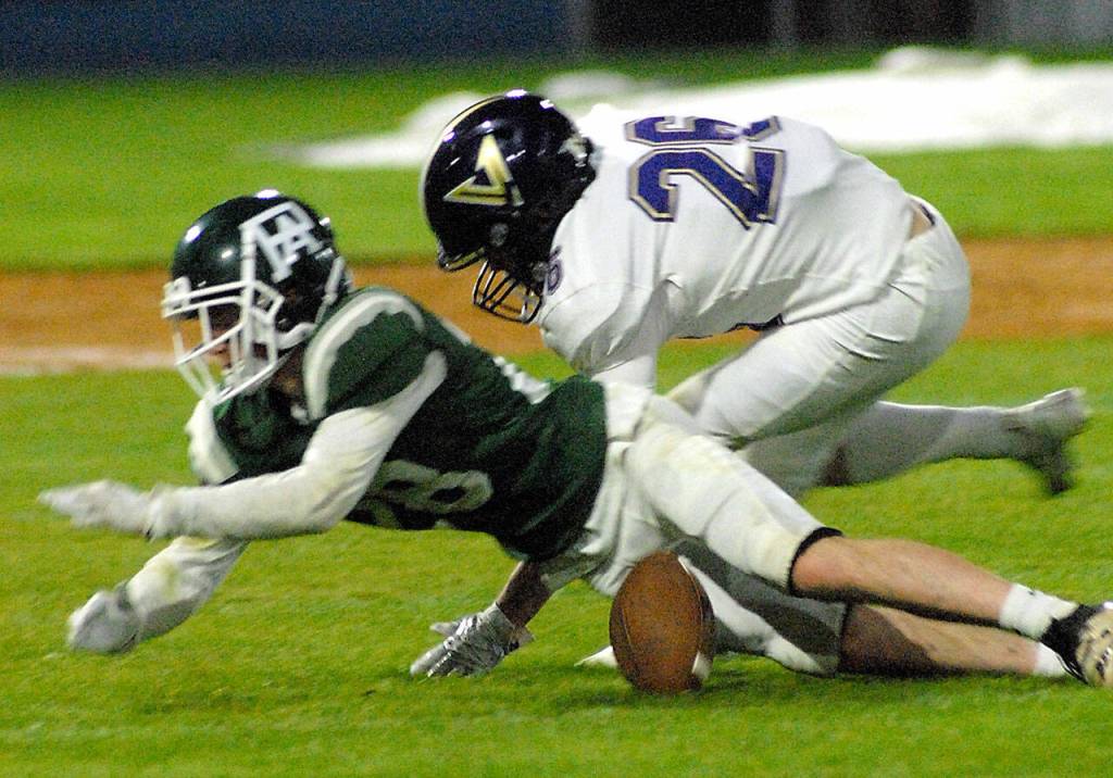 Keith Thorpe/Peninsula Daily News Port Angeles receiver Brantyn Fisler, left, gets the ball knocked away by North Kitsap’s Karsen Walsh during Friday night’s game at Port Angeles Civic Field.