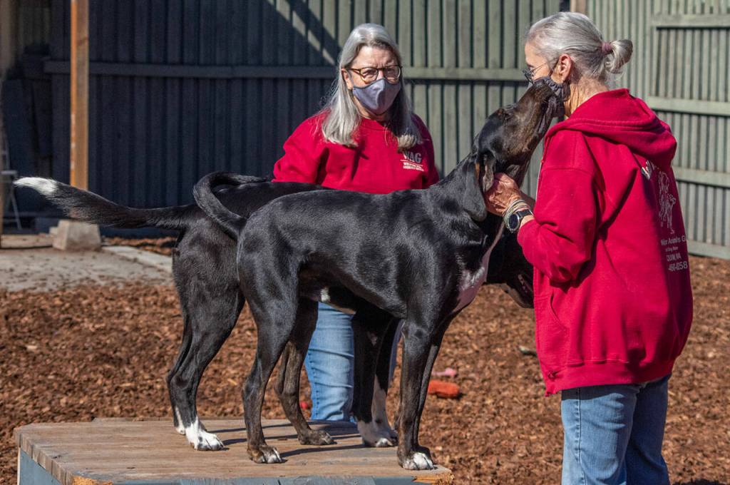 Hank the hound gives Joy Brown a kiss from the agility equipment that she and her husband Cliff Brown built at WAG in Sequim. Vice President Deb Bemm stands behind Franco the hound. Both young dogs need lots of exercise, Brown and Bemm said. They have a dedicated dog walker as well as other volunteers who play and exercise them. (Emily Matthiessen/Olympic Peninsula News Group)