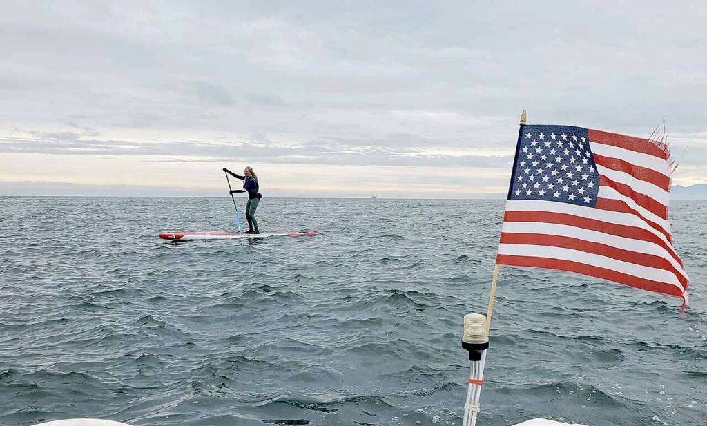 PORT ANGELES — A 32-year-old Port Angeles paddleboard champion raced across the Strait of Juan de Fuca on a board she calls her rocket ship to raise money for care of domestic violence survivors.
