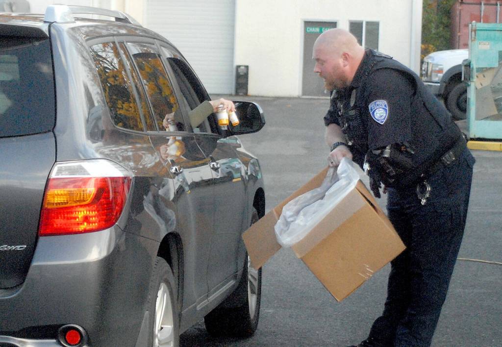 Officer Mike Johnson of the Port Angeles Police Department accepts a drop-off of unwanted drugs on Saturday in the parking lot of the Clallam County Courthouse as part the National Prescription Drug Take Back Day.