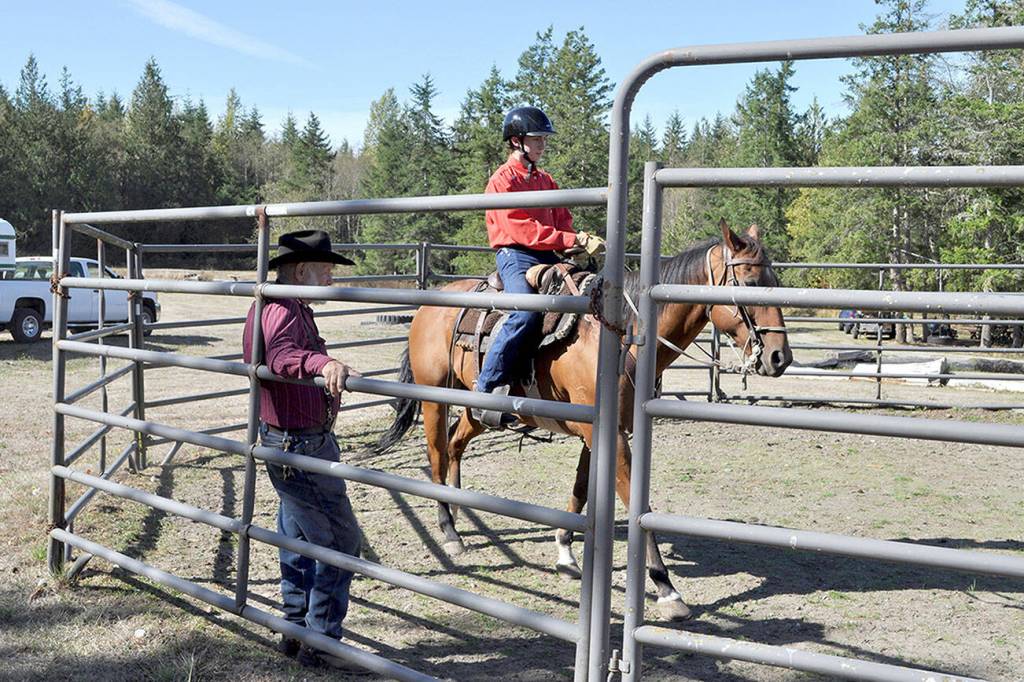 Back Country Horsemen of Washington Peninsula Chapter member Del Sage helps a Scout with Troop 1498 with his horse-riding skills at Layton Hill Horse Camp. (Courtesy of Linda Morin)