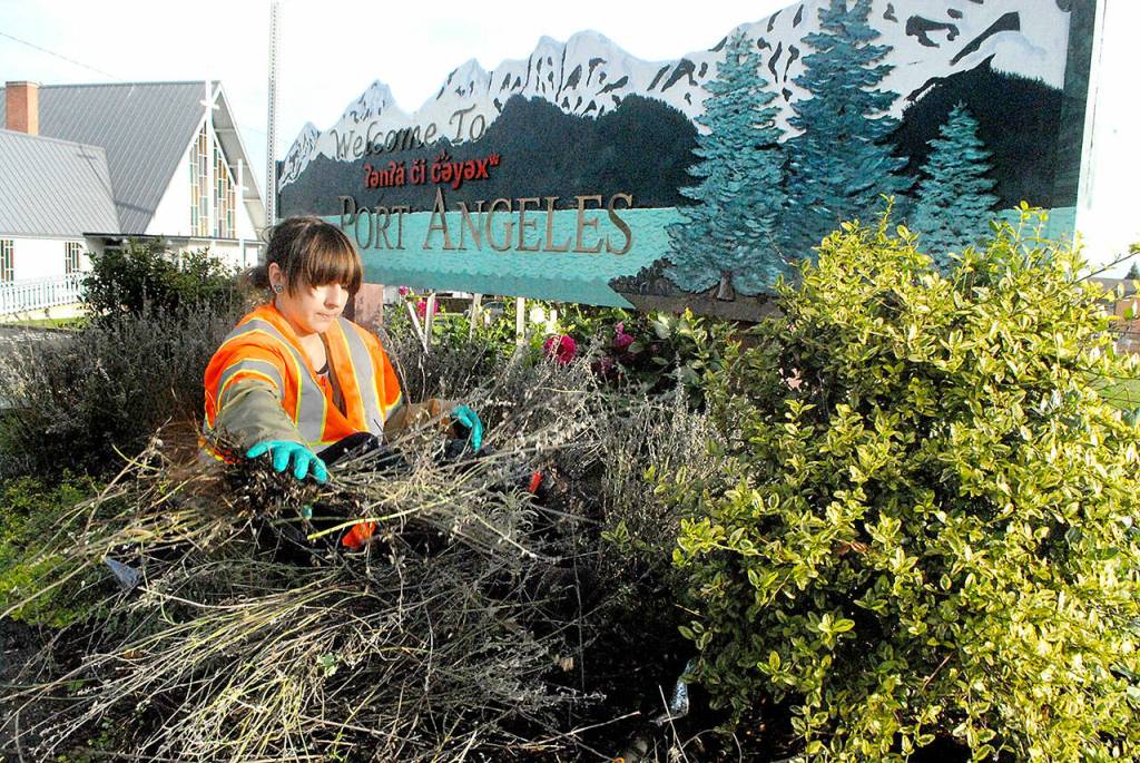 Port Angeles Parks and Recreation Department seasonal worker Destiny Walters removes unwanted growth from the garden in front of the Port Angeles welcome sign at Lincoln Street and Lauridsen Boulevard on Wednesday. The sign includes a greeting to visitors in the Klallam language.