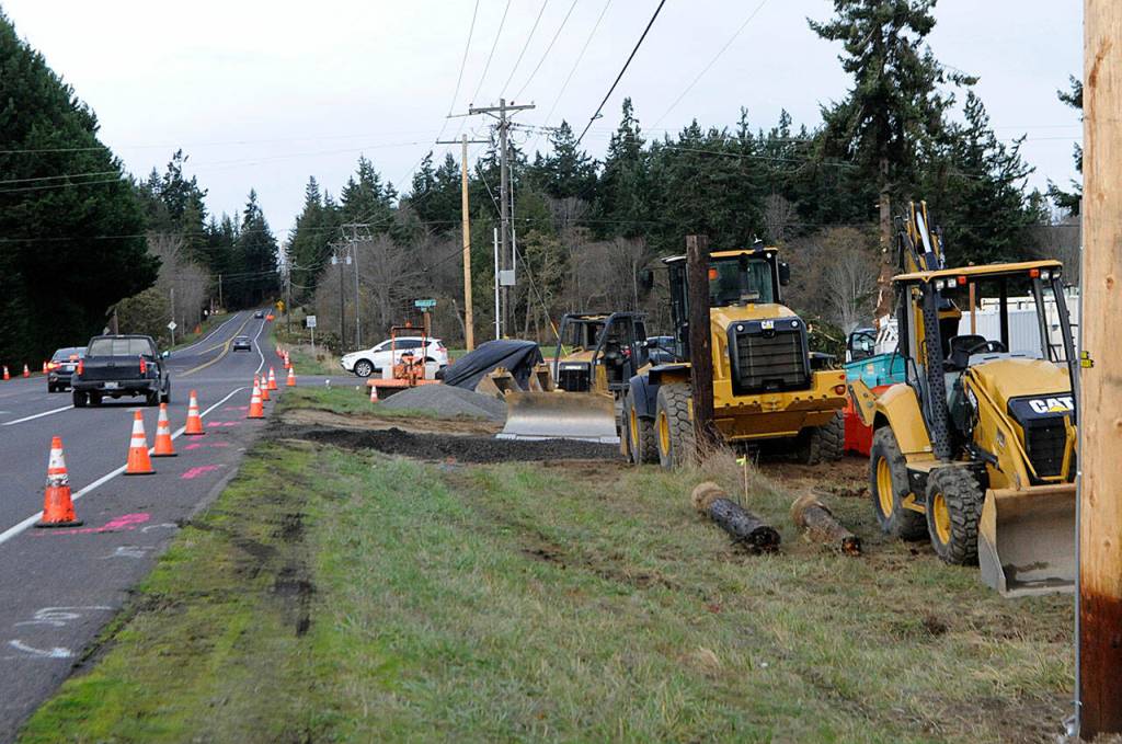 Crews with Interwest Construction began work just east of the planned 160-foot roundabout on Monday, with Clallam County roads staff previously saying traffic will move to one side or the other as construction progresses with no long-term traffic delays anticipated.