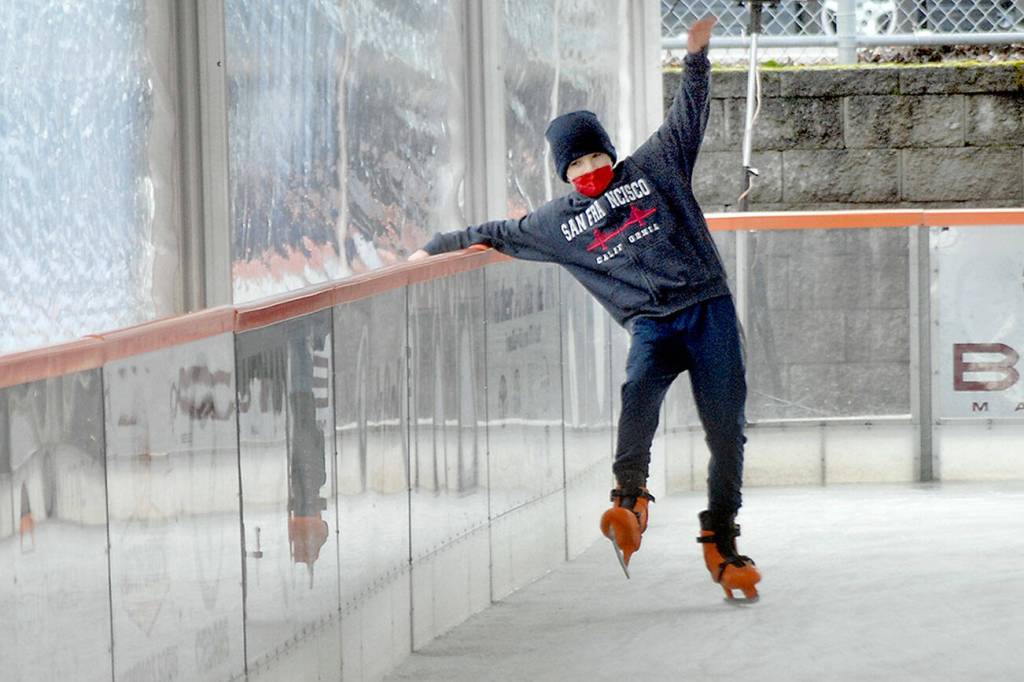 Joshua Wakefield, 11, of Sequim tries to keep his balance while learning the fine nuances of ice skating on Friday’s opening day of the Port Angeles Winter Ice Village in downtown Port Angeles.