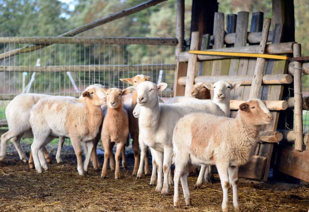 The Icelandic sheep, who live among the many animals at Port Townsend’s Foggy Hog Farm, stick together in their pen Wednesday morning. (Diane Urbani de la Paz/Peninsula Daily News)