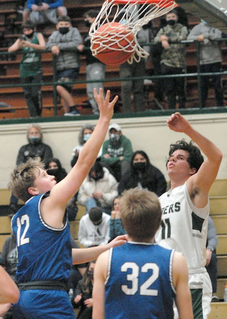 Keith Thorpe/Peninsula Daily News Port Angeles’ Xander Maestas, right, puts it through the net as North Mason’s Clay Averts, left, and Connor McColm hope for a rebound during Thursday’s game at Port Angeles High School.