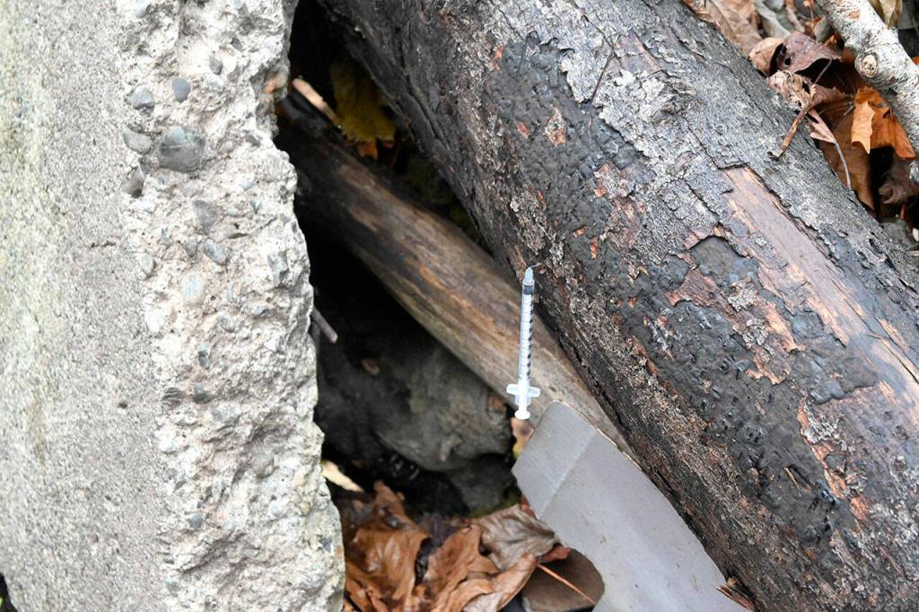 Within minutes, he spotted two more syringes stuck in wood and dirt in the tiny clearing, the gentle static of rushing water in the background.