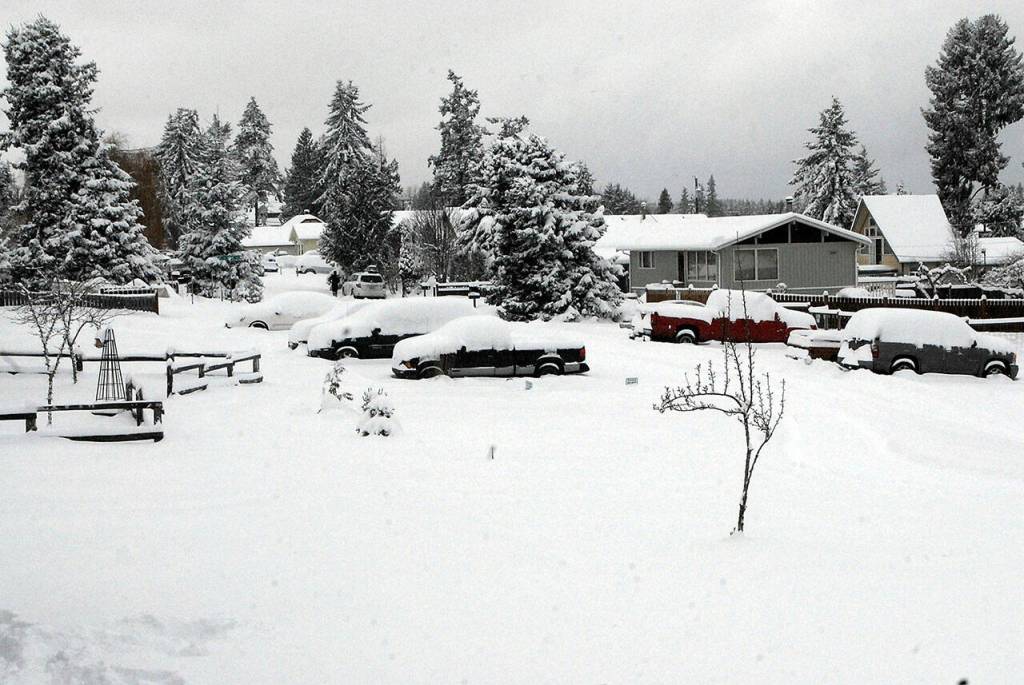 Nearly a foot of snow fell in areas of the North Olympic Peninsula, including a neighborhood near Golf Course Road in Port Angeles. (Brian McLean/Peninsula Daily News)